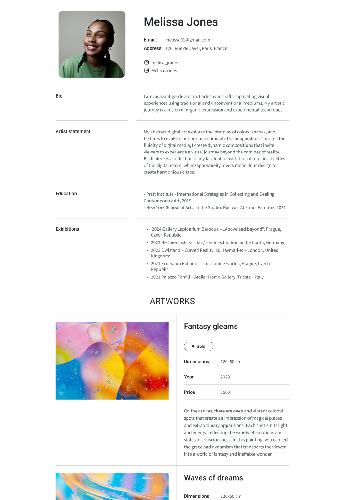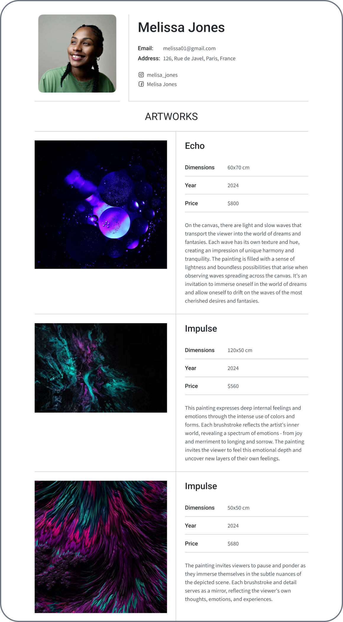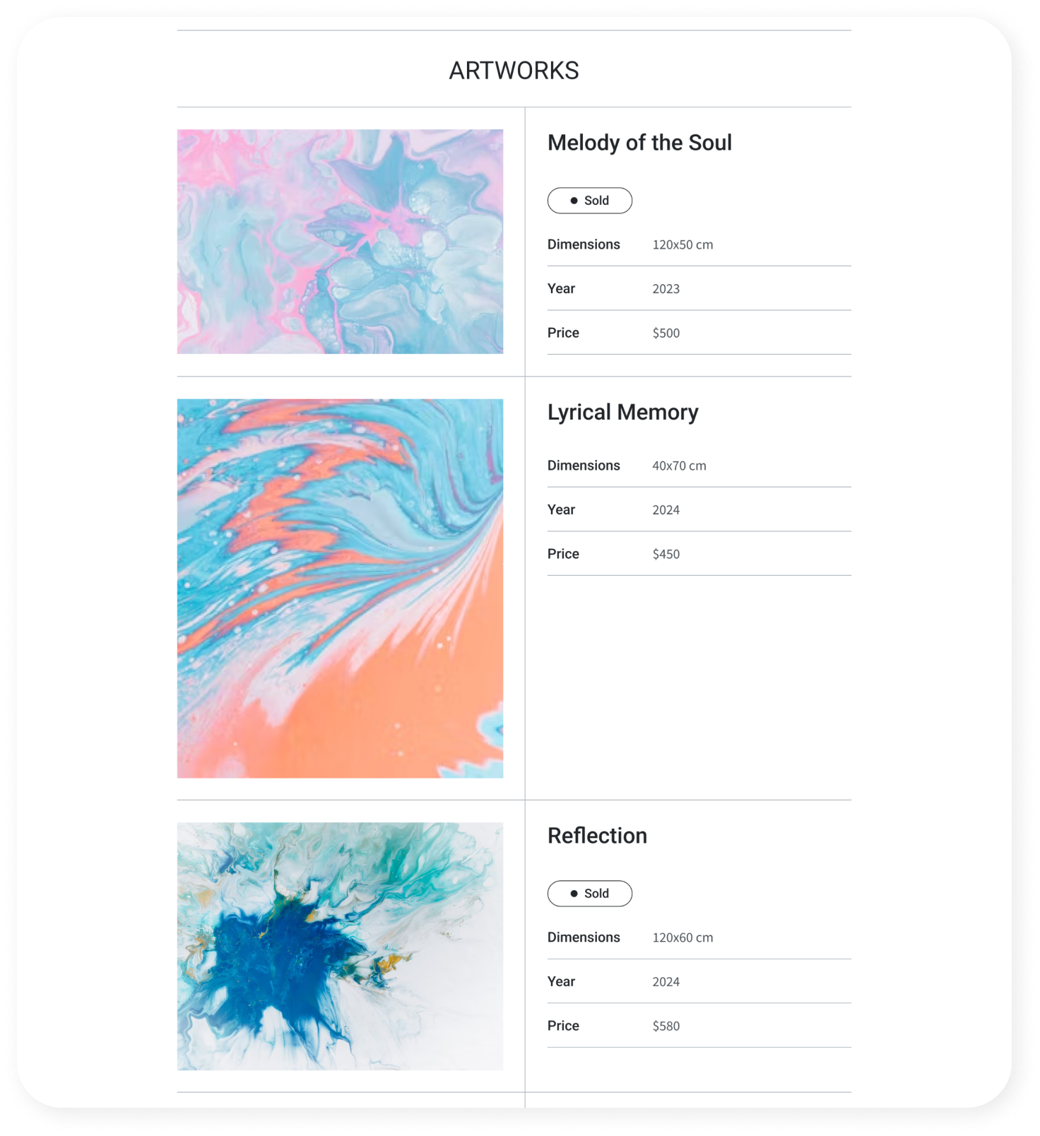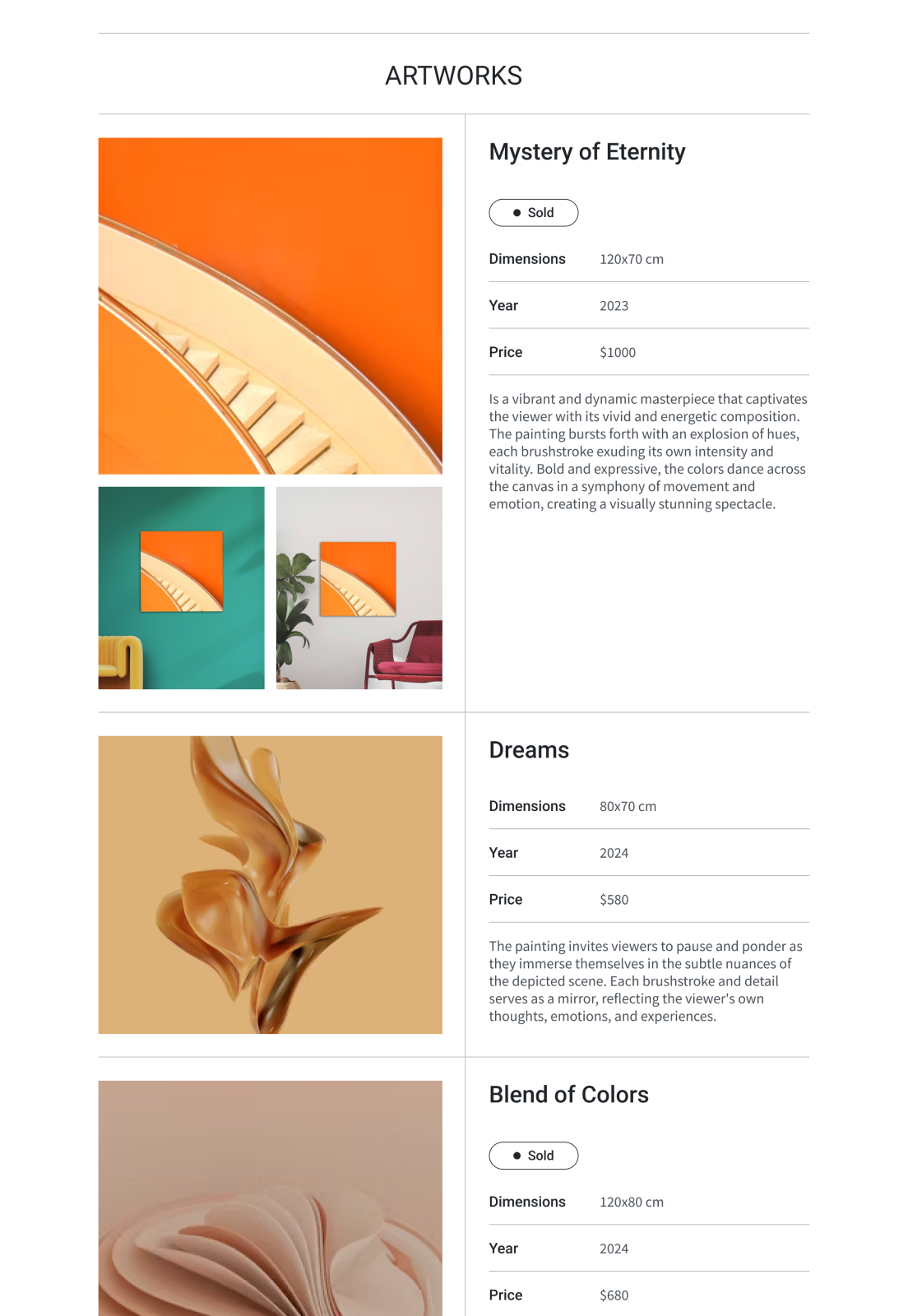 Keep your artworks organized. Generate a portfolio or a list of available works anytime you need. Update easily and send them to your potential collectors.