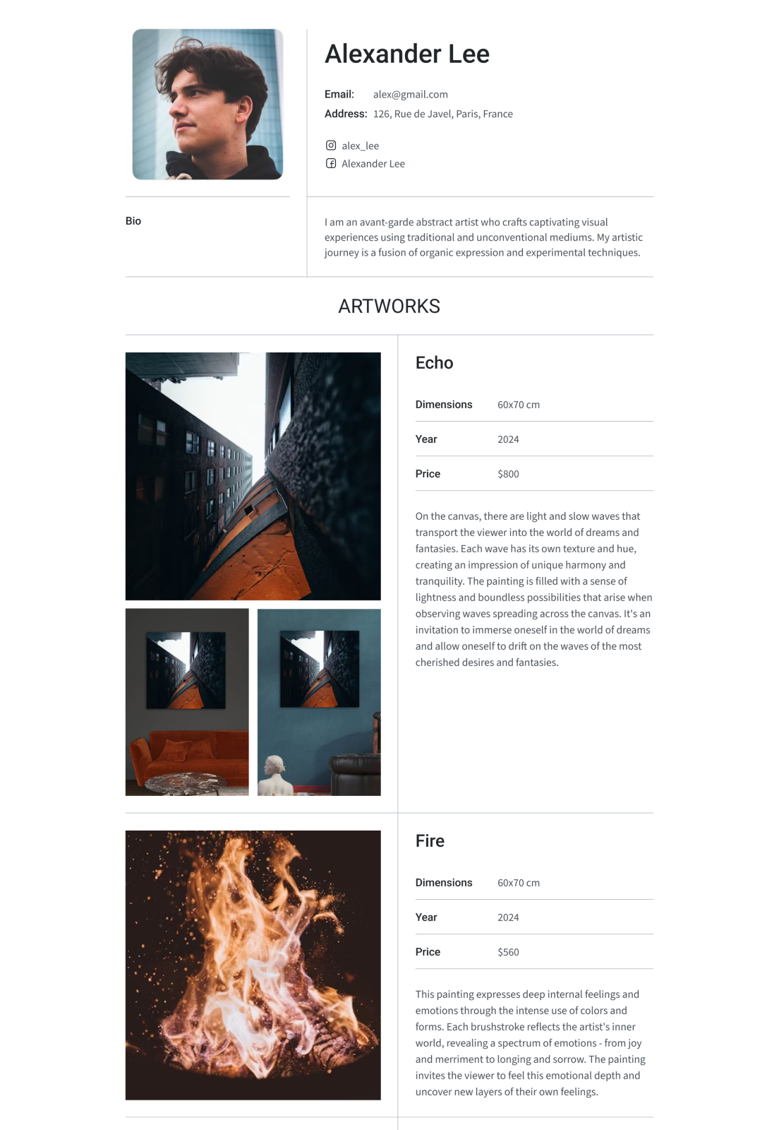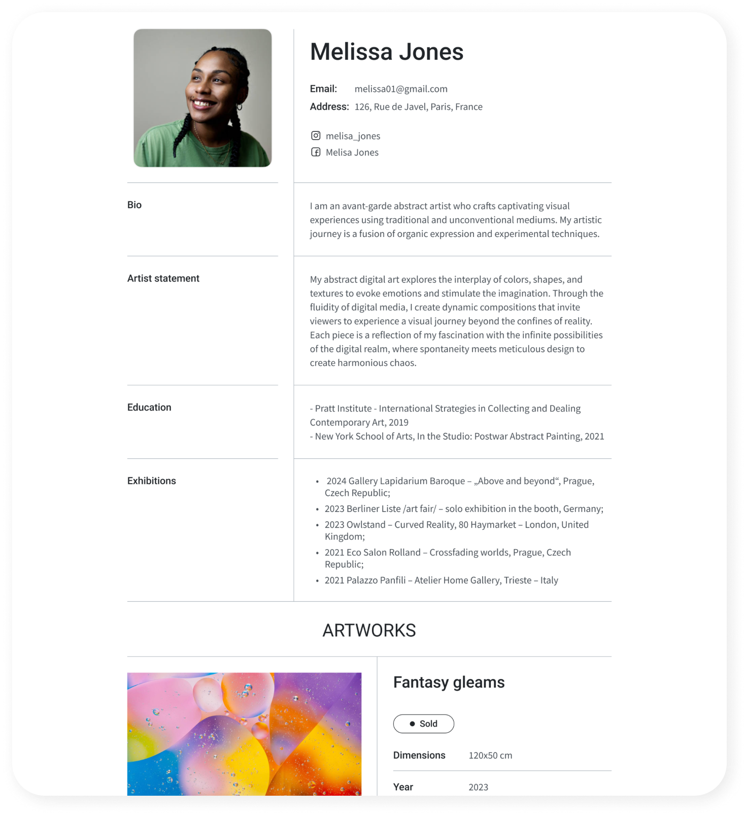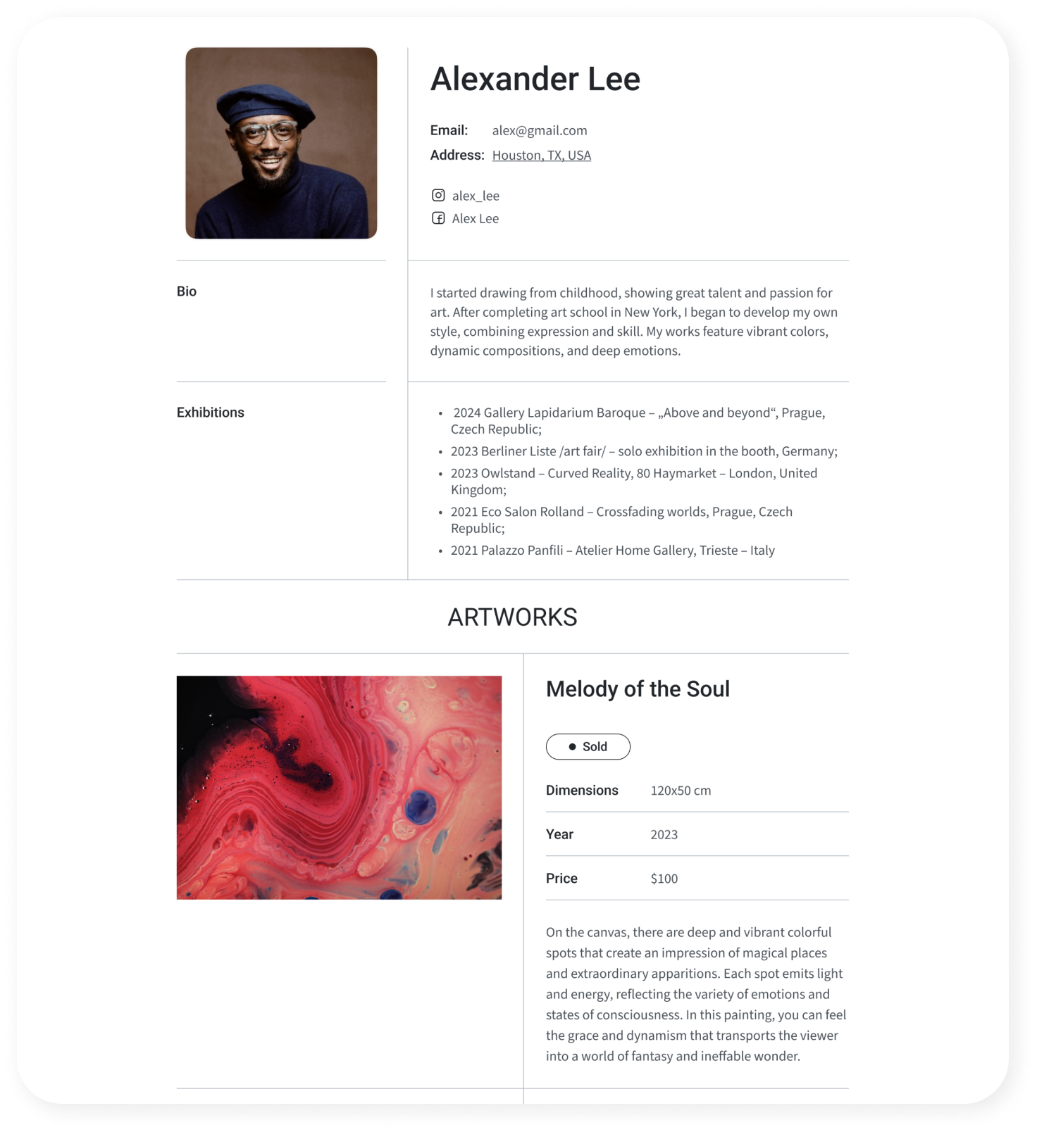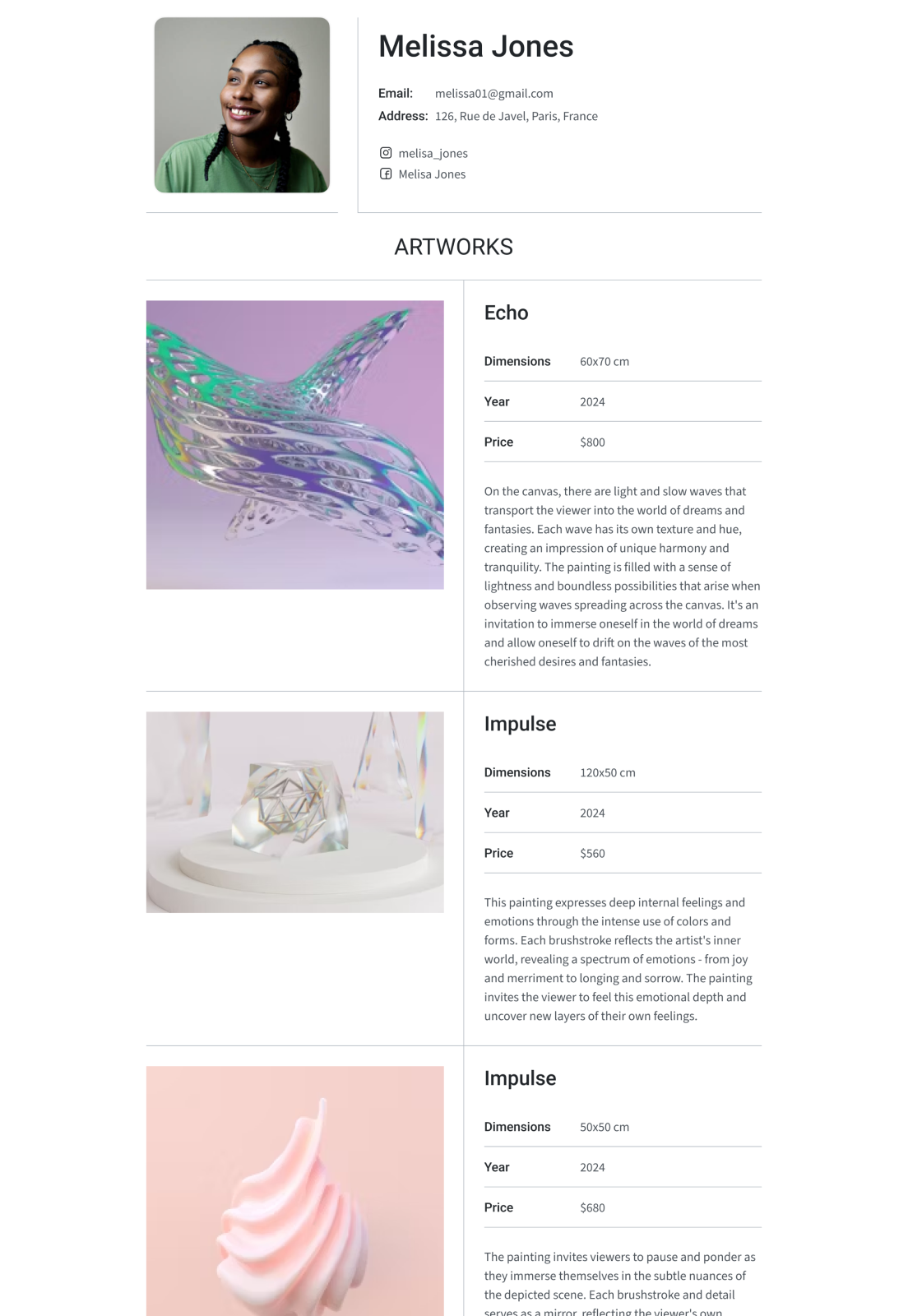 Keep your artworks organized. Generate a portfolio or a list of available works anytime you need. Update easily and send them to your potential collectors.