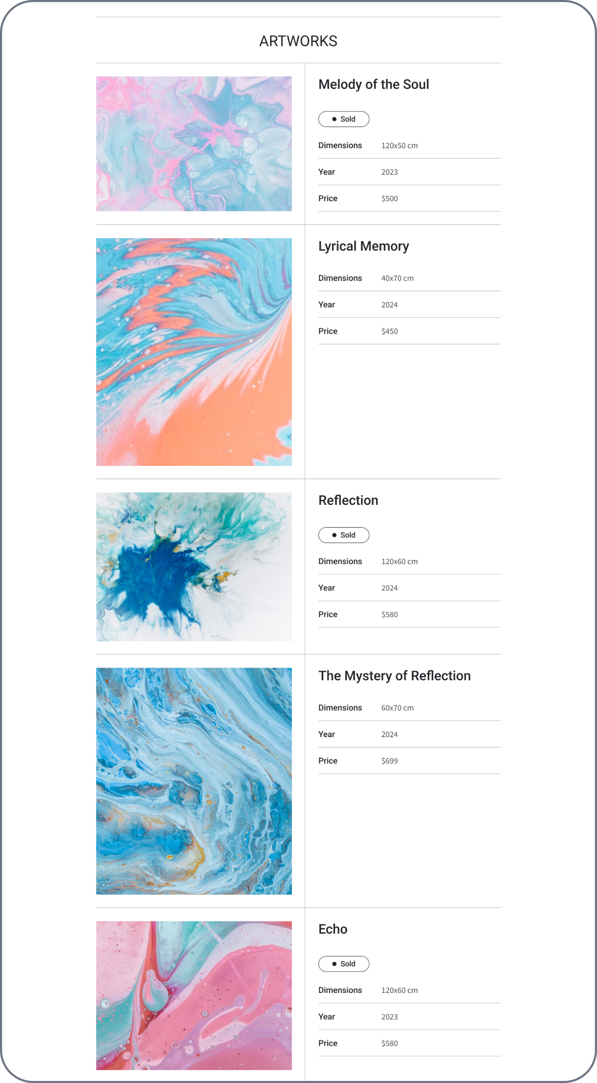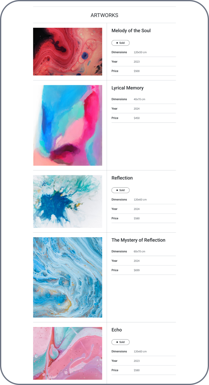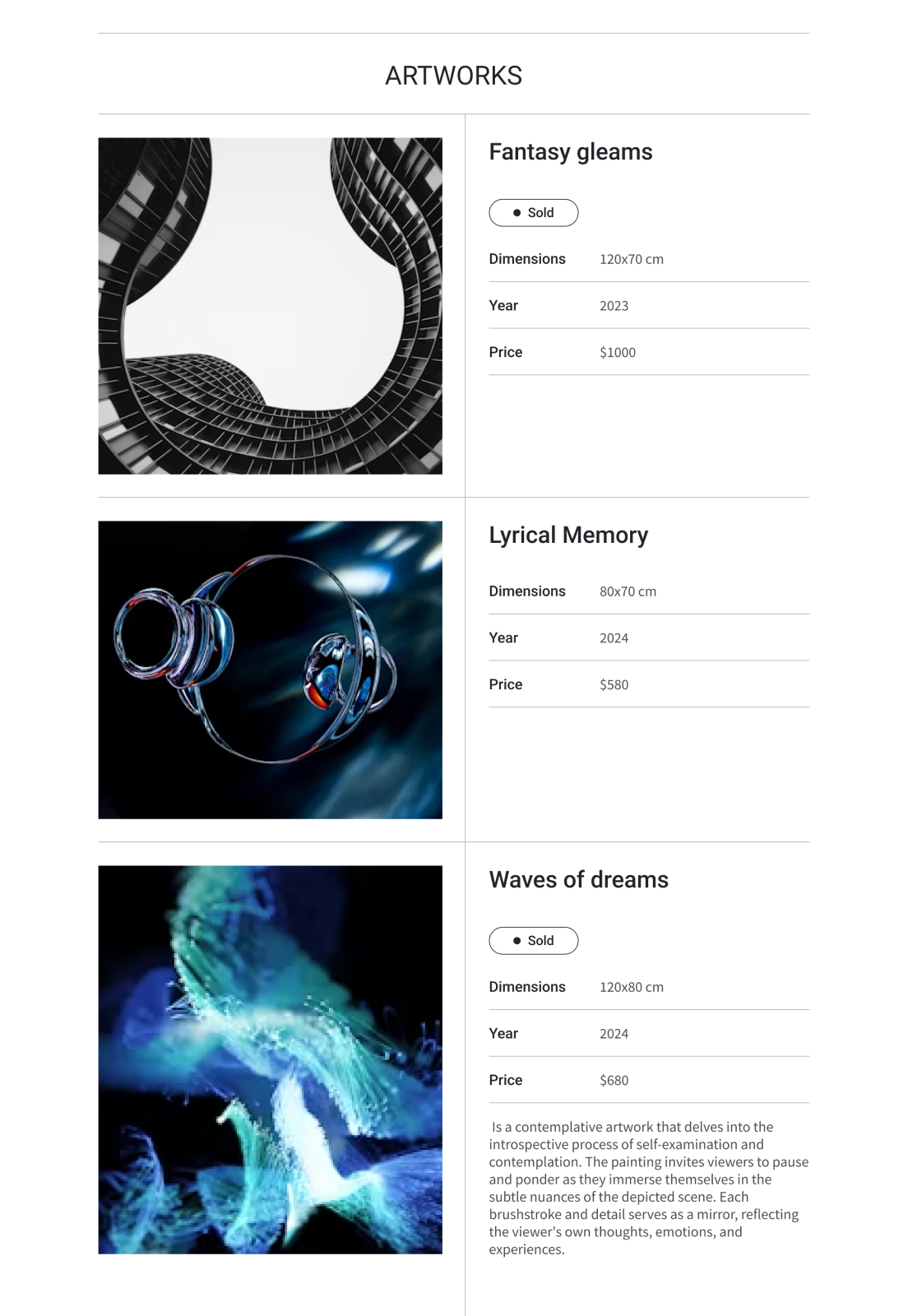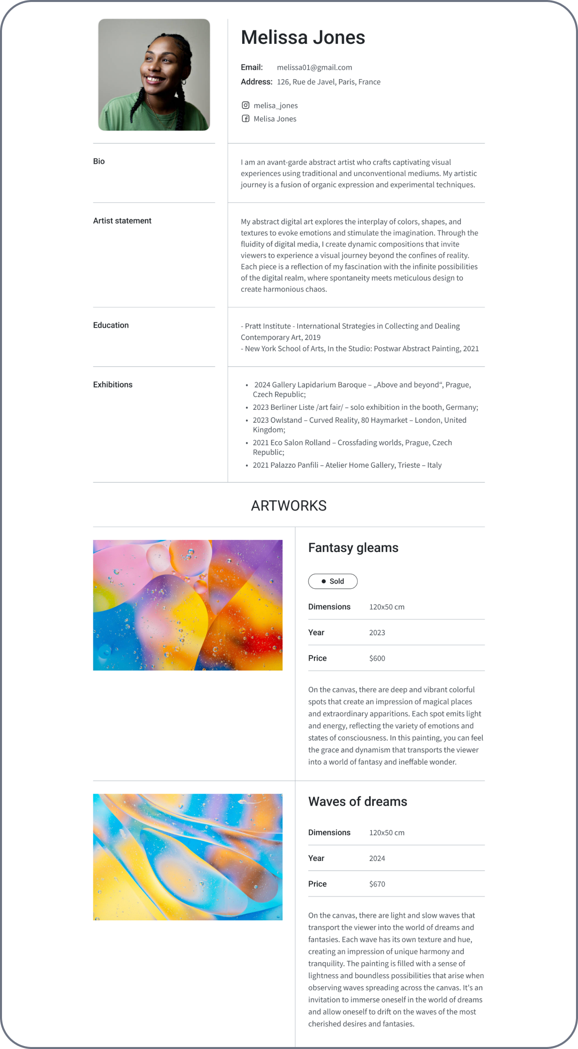 Keep your artworks organized. Generate a portfolio or a list of available works anytime you need. Update easily and send them to your potential collectors.